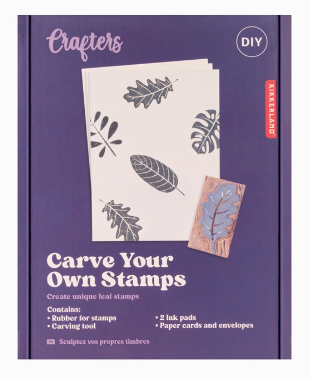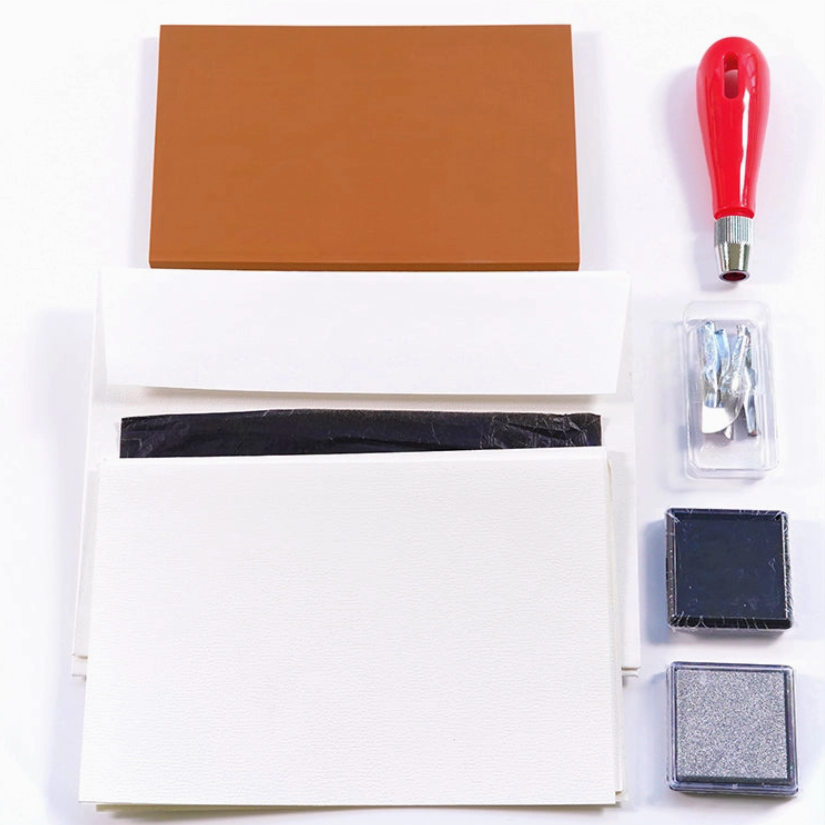 This kit give you all the materials you need to create colorful, original prints. TPR block, black stamp, silver stamp, 3 sets of card & envelopes, 1 piece of carbon paper, 1 set of plastic carving knives, template and an instruction sheet.