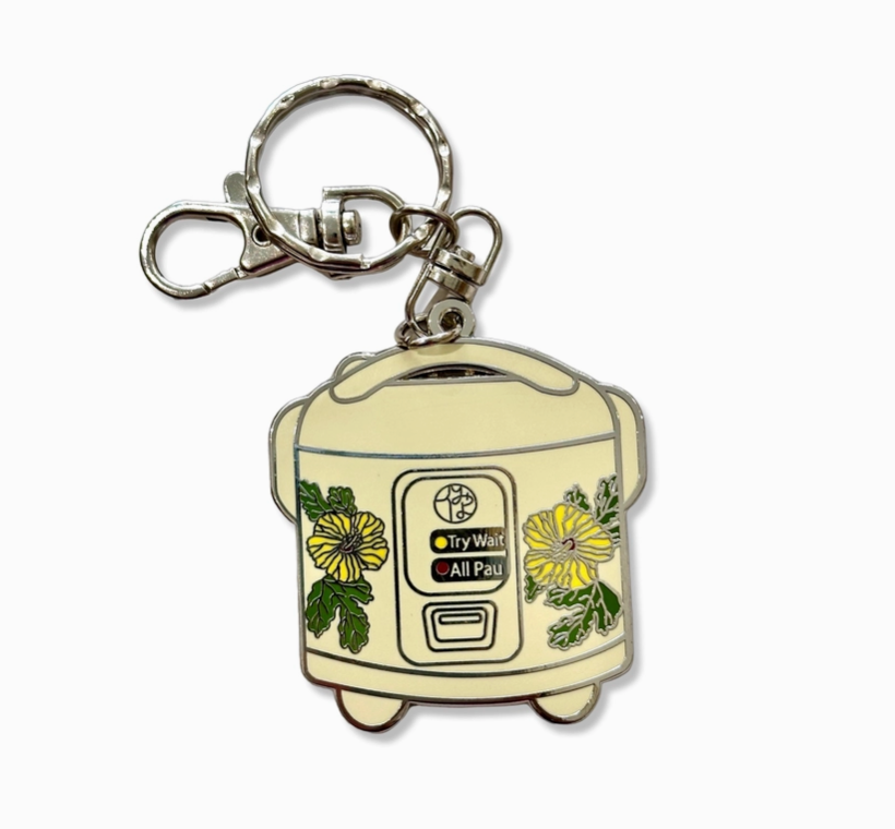 I’ve always wanted to draw a rice cooker! Inspired by the vintage Panasonic ones with beautiful botanical illustrations. I decided on a native pua that represents Hawaiʻi, maʻo hau hele or the yellow hibiscus, our state flower. Blending two cultures together is a consistent theme in my art, hence the simple title of “Hapa Rice.” 2" silver color enamel nickel plating
