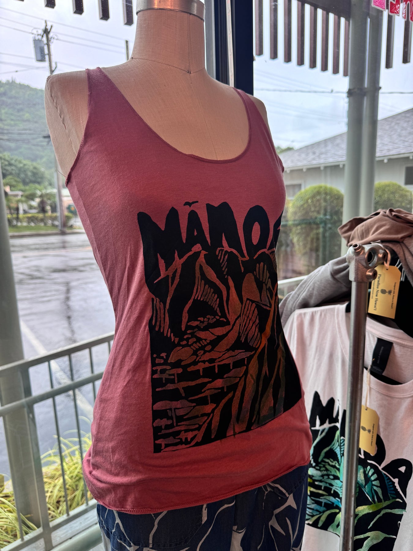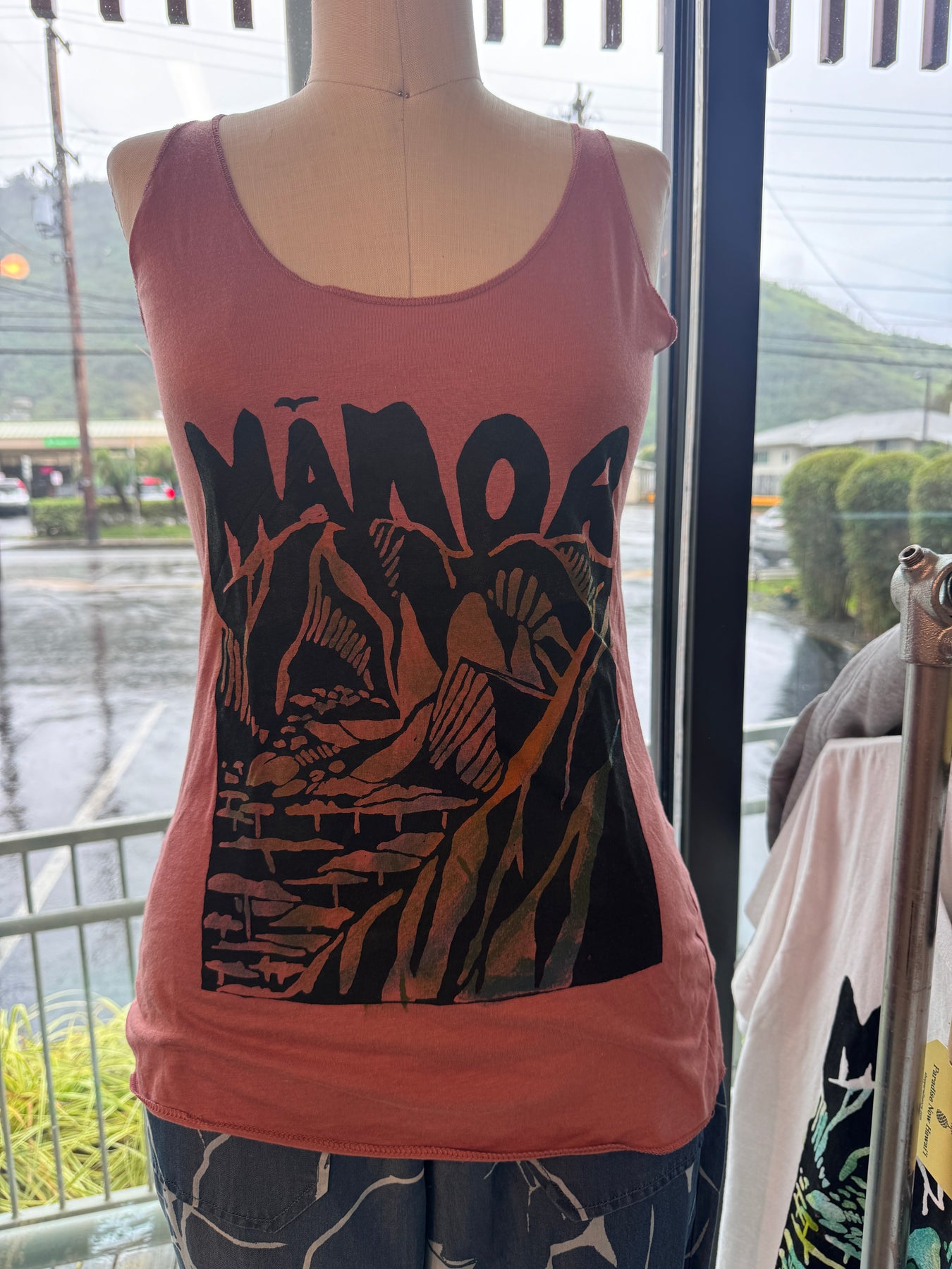 Mannequin wearing a pink tank top with black graphic design outdoors.