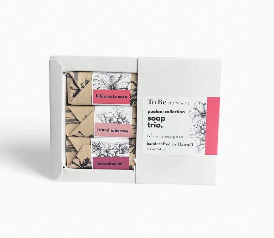 Pualani – The Exfoliating Bar Soap Trio 🌺✨ Indulge in the essence of Hawaii’s most captivating florals with the Pualani Exfoliating Soap Trio—a handcrafted collection inspired by the fragrant blooms of the islands. Infused with creamy coconut milk, freshly dried coconut and hawaiian sea salt, each bar creates a luxurious, sudsy lather that gently exfoliates while leaving skin soft and radiant. 🌸 Includes 3 Mini Exfoliating Bars (1.5 oz each): ✔ Hibiscus Breeze – A delicate fusion of hibiscus, rose water, vanilla, and ylang-ylang. ✔ Island Tuberose – A lush bouquet of tuberose, plumeria, and warm sandalwood. ✔ Hawaiian Lei – A timeless floral blend of jasmine, red ginger, and tropical blossoms.